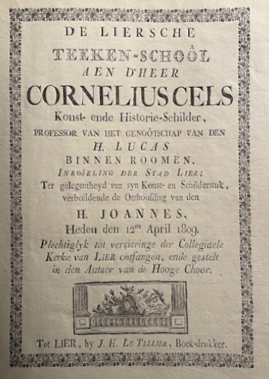 - De Liersche teeken-schoôl aen d’heer Cornelius Cels konst- ende historie-schilder, professor van het genoôtschap van den H. Lucas binnen Roomen, inboôrling der Stad Lier; ter gelegentheyd van syn konst- en schilderstuk, verbeéldende de onthoofding van den H. Joannes, heden den 12ste april 1809, plechtiglyk tot verçieringe der collegiaele kerke van Lier ontfangen, ende gestelt in den autaer van de hooge choor, Lier, J.H. Le Tellier, 1809, 8 blz. Dit gelegenheidsgedicht werd aan Cels geschonken door zijn oud-leraar Pieter Jozef Denis en diens leerlingen die allen bij naam worden vermeld. Het gaat om een tot nog toe onbekend Liers drukwerk.