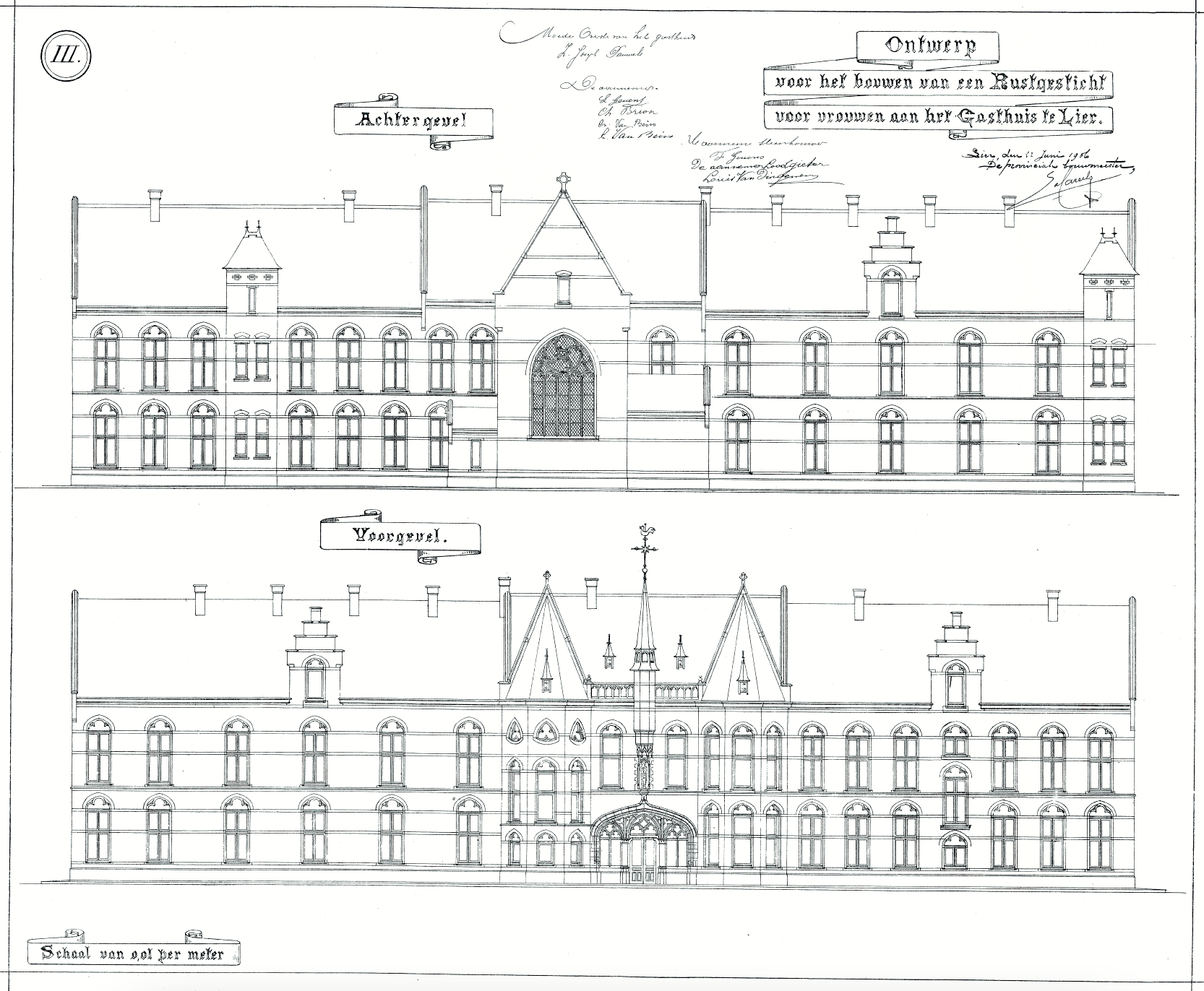 De huidige ziekenhuissite bevindt zich in het historische stadscentrum waardoor kan verwacht worden dat hier reeds zeer vroeg bebouwing aanwezig geweest is. Historisch kaartmateriaal laat zien dat de site zich net buiten de 14de -eeuwse stadsomwalling bevindt, maar nooit bebouwd blijkt te zijn. De gronden werden in de plaats gebruikt als open oefenveld met schuttersdoelen voor de Kolveniersgilde, van waar later de straatnaam ‘Kolveniersvest’ is afgeleid. De 19de eeuw bracht in alle grote steden een grote wijziging in het stadsbeeld en -beleving met zich mee, dit gebeurde ook in zekere mate in Lier. Door de Industriële Revolutie verhuisde de bevolking massaal van het platteland naar de steden, waardoor de stadscentra een ware bevolkingsexplosie kenden. Het gevolg hiervan was dat quasi alle open buitenruimtes uit het ancien régime ook werden bebouwd zodat de stad een veel denser stadsweefsel kreeg. Ook beeldbepalende ruimtelijk-structurerende stedelijke infrastructuur verdween tijdens deze periode, zo werden de vlieten overdekt en werden de stadswallen afgebroken. In de nabijheid van het oude schuttersveld en de vrijgekomen gronden van de afgebroken stadswal werd uiteindelijk tussen 1868 en 1873 het Sint-Elisabethgasthuis opgetrokken op de zogenaamde “Veldekens”, naar ontwerp van de Mechelse bouwmeester Ch. Drossaert. De gasthuiszusters-Augustinessen zouden al sinds de 12de eeuw in Lier gevestigd geweest zijn.1 Het gasthuis langs de Mechelsestraat zou in 1987 volledig afgebroken worden voor de aanleg van parkeerplaatsen en nieuwe ziekenhuisgebouwen van het Heilig Hartziekenhuiscomplex.