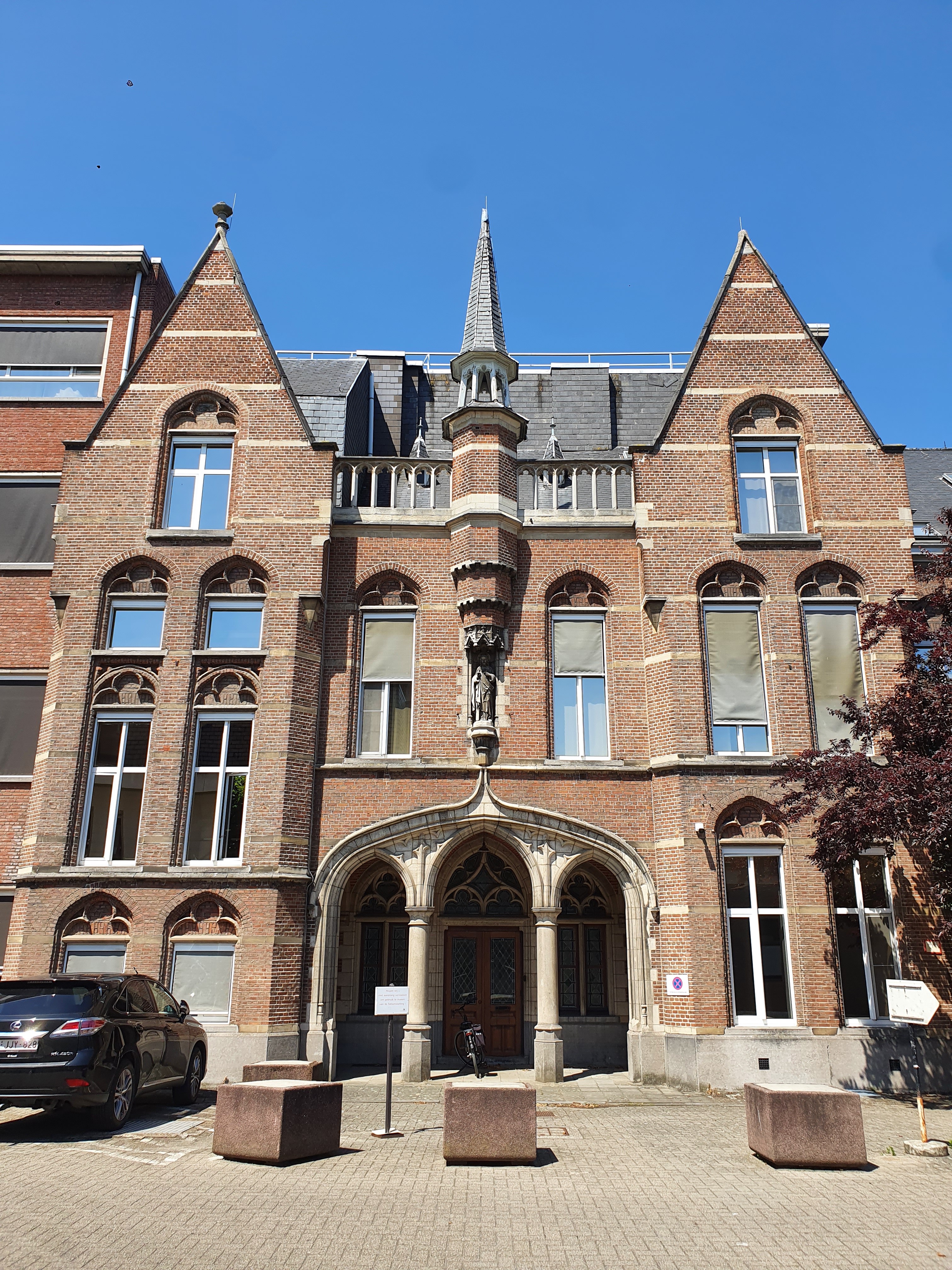Ter hoogte van de gesloopte huisjes langs de straat werd een doorgang naar de centrale inkom van de vleugel gemaakt, geflankeerd door een nieuwe (inmiddels gesloopte) portierswoning. Deze woning werd in dezelfde neogotische stijl opgetrokken als de ziekenhuisvleugel. De neogotiek werd tijdens deze periode typisch gebruikt voor katholieke gebouwen, denk ook aan kerken en scholen die in deze stijl opgetrokken werden. Hiermee werd namelijk via architectuur een statement gemaakt. De middeleeuwse gotiek werd met zijn monumentale kathedralen gezien als hoogtepunt van de kerkenbouw waardoor men tijdens de 19de-eeuwse katholieke revival deze stijl wilde hergebruiken als verwijzing naar deze hoogperiode van de Kerk. Dit was dus een zeer conservatieve manier van bouwen, passend bij een conservatief instituut. Meer progressieve, liberale, bouwheren daarentegen gingen eerder moderne stijlen gebruiken, zoals bijvoorbeeld de art nouveau.