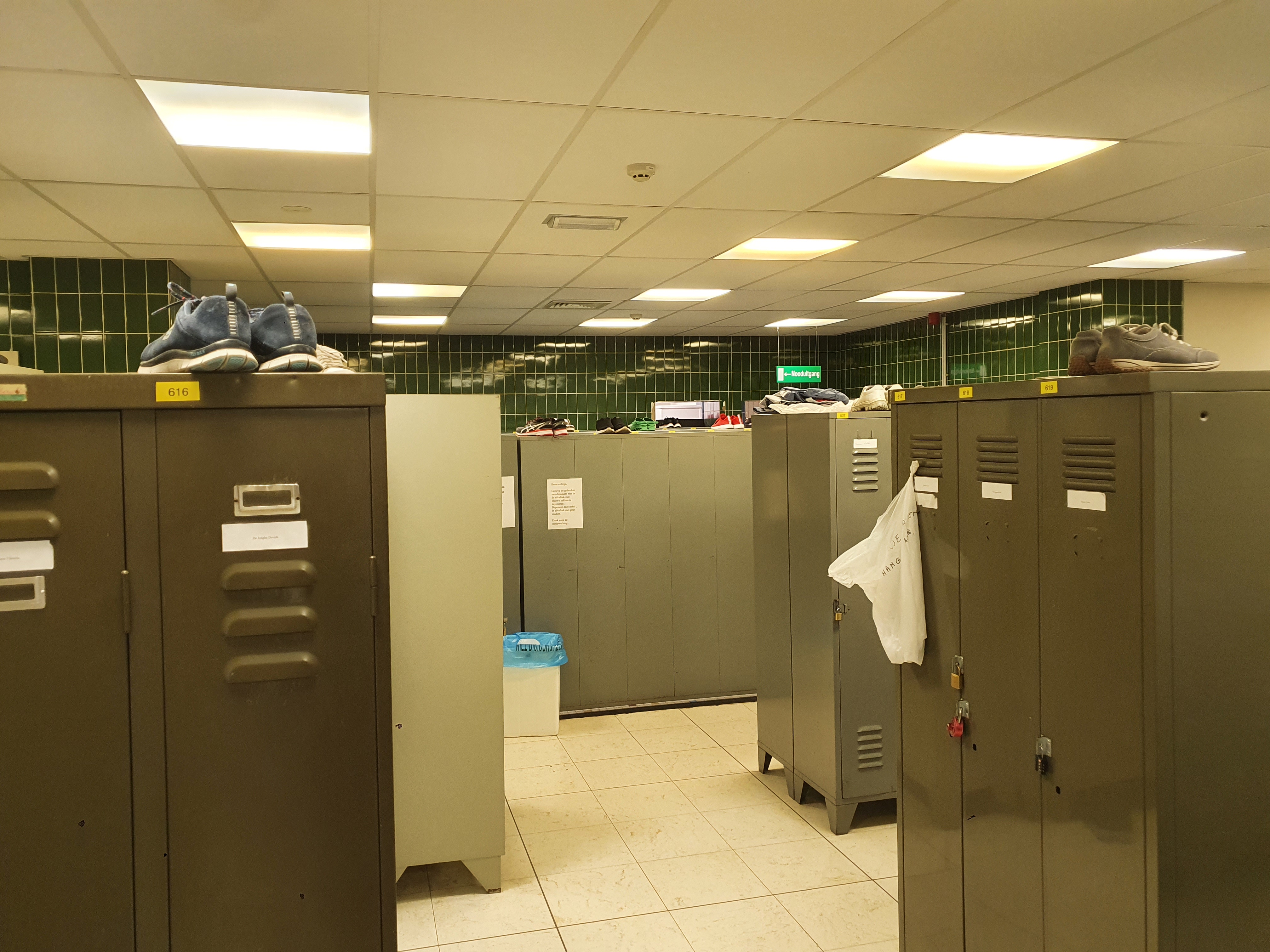 Vanbinnen blijkt de fraaie kapel inmiddels jammer genoeg volledig mismeesterd. Aangezien het religieuze aspect binnen het ziekenhuis wegviel na WOII was er geen nood meer aan een kapel en werd deze door middel van onrespectvolle verbouwingen ingrijpend herbestemd. De hoge ruimte werd door een nieuwe vloerplaat in twee niveaus opgedeeld, waarbij de begane grond ingericht werd als banale kleedkamers en bovenaan de cafetaria voor het personeel voorzien werd. Op de bovenverdieping is het historische interieur van de kapel wel nog duidelijk afleesbaar aan de decoratieve glas-in-lood ramen en de houten gewelven met neogotische schilderingen. Op het gelijkvloers werden echter alle wandschilderingen bezet met wandtegels en werd de voorheen open ruimte met binnenwandjes opgedeeld.