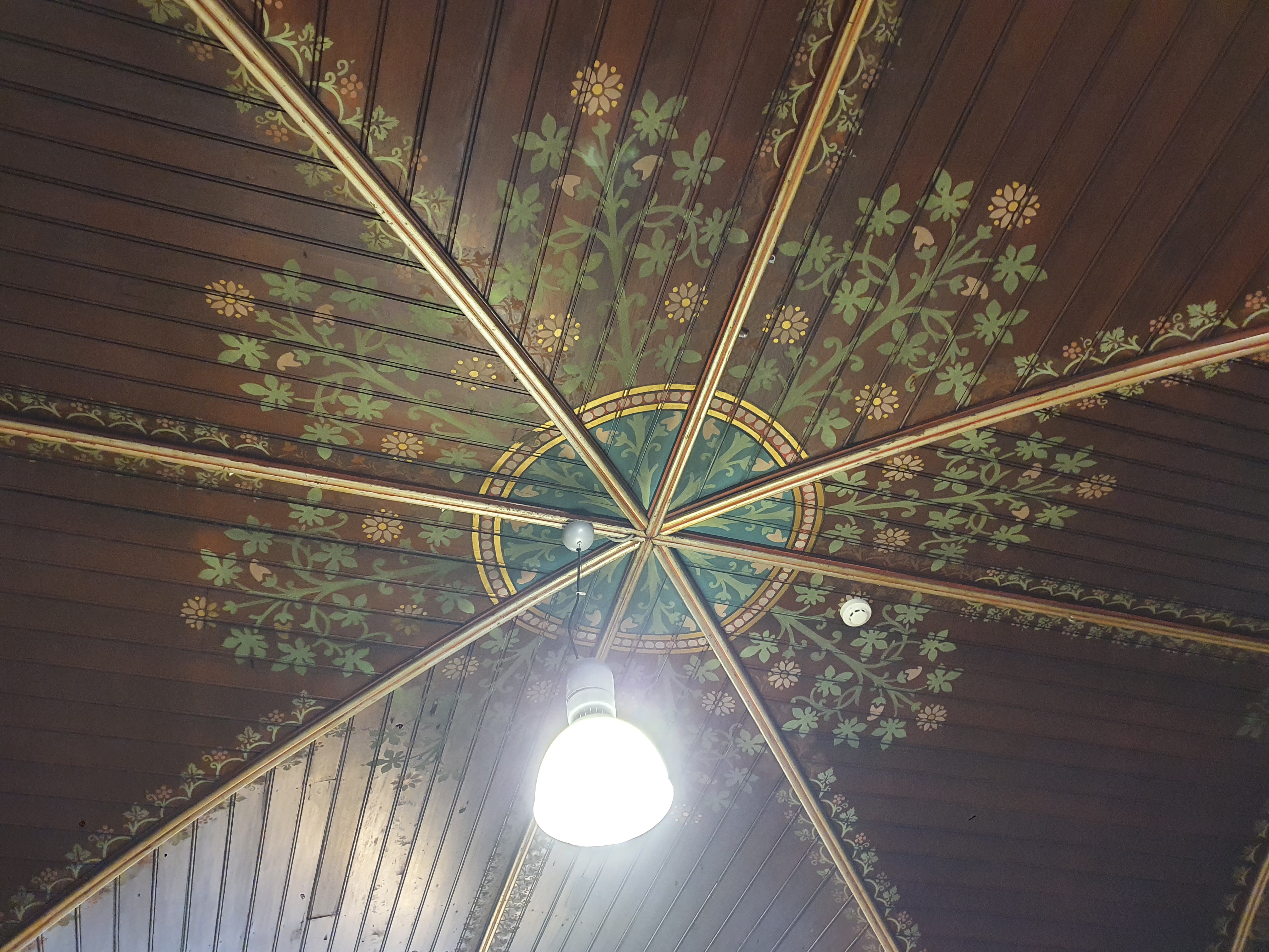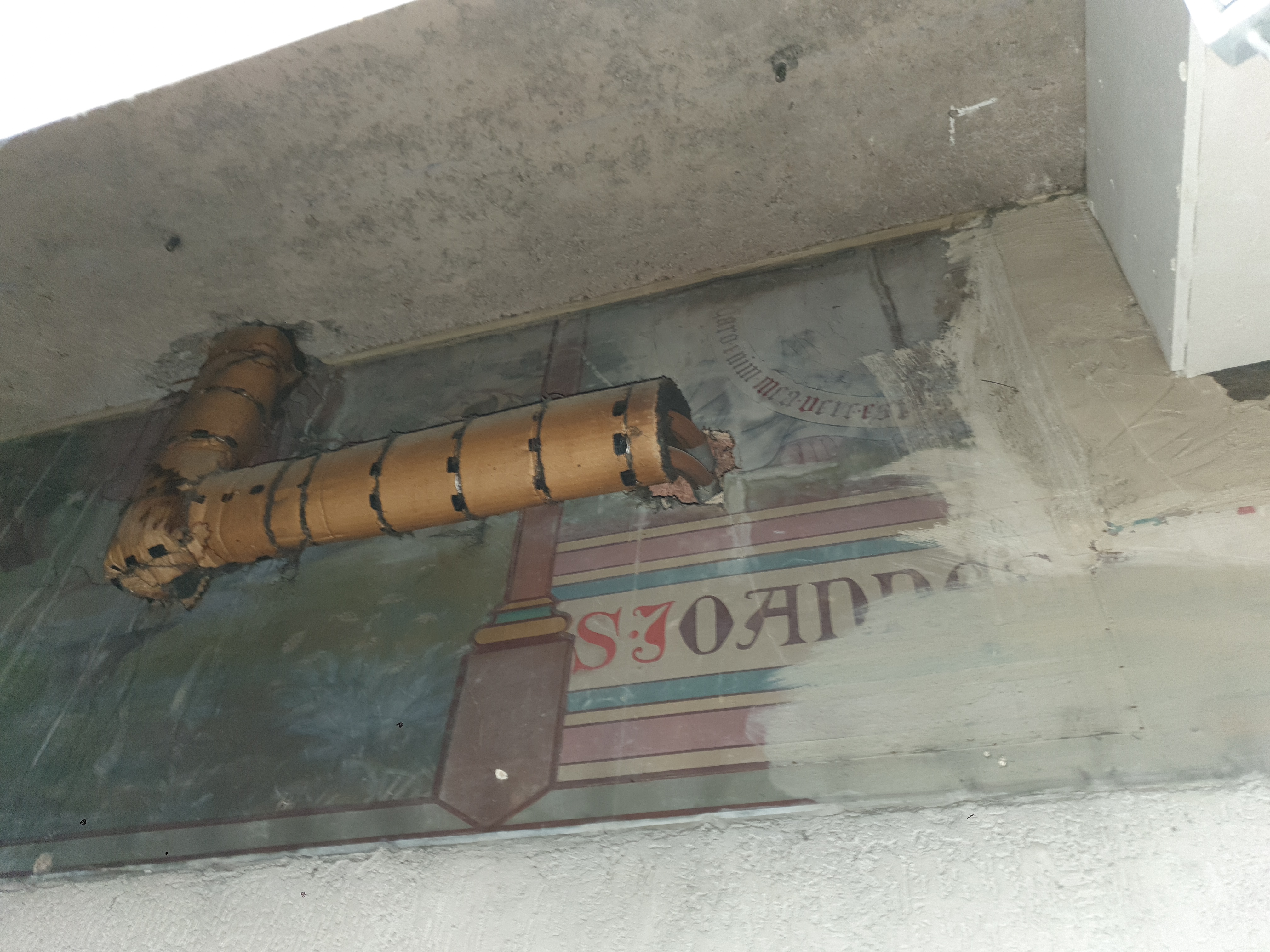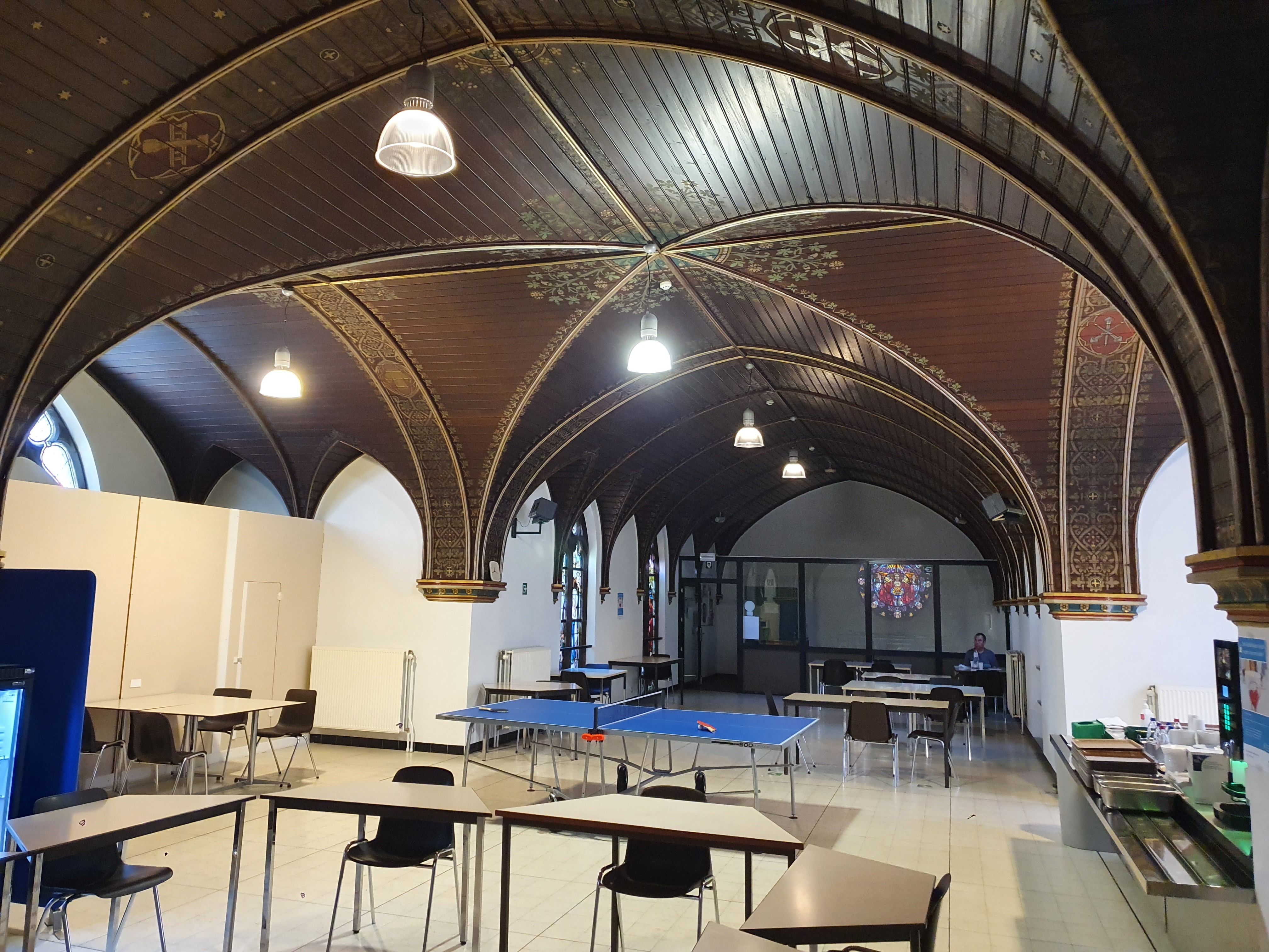 Achter het verlaagde plafond zijn de restanten van de waardevolle wandschilderingen nog te zien, die op een ongegeneerde wijze werden doorboord door ventilatiekanalen en de nieuwe vloerplaat. Er wordt van uitgegaan dat de rest van de wandschilderingen nog aanwezig is achter de huidige verflagen van de refter. Bij de verbouwing verdween ook het bijhorende neogotische meubilair, zoals het indrukwekkende centrale altaar. Het enige overlevende meubelstuk uit de kapel betreft een doopvont, dat inmiddels naar de inkomzone werd verplaatst. Aangezien dopen doorgaans met een parochiekerk geassocieerd wordt zou intuïtief kunnen gedacht worden dat dit doopvont een recuperatie element uit een kerk zou moeten zijn dat naar hier verplaatst werd. Maar in werkelijkheid vonden er ook bevallingen plaats in het gasthuis en in geval van nood moest er onmiddellijk gedoopt kunnen worden, waardoor een doopvont hier absoluut noodzakelijk was.